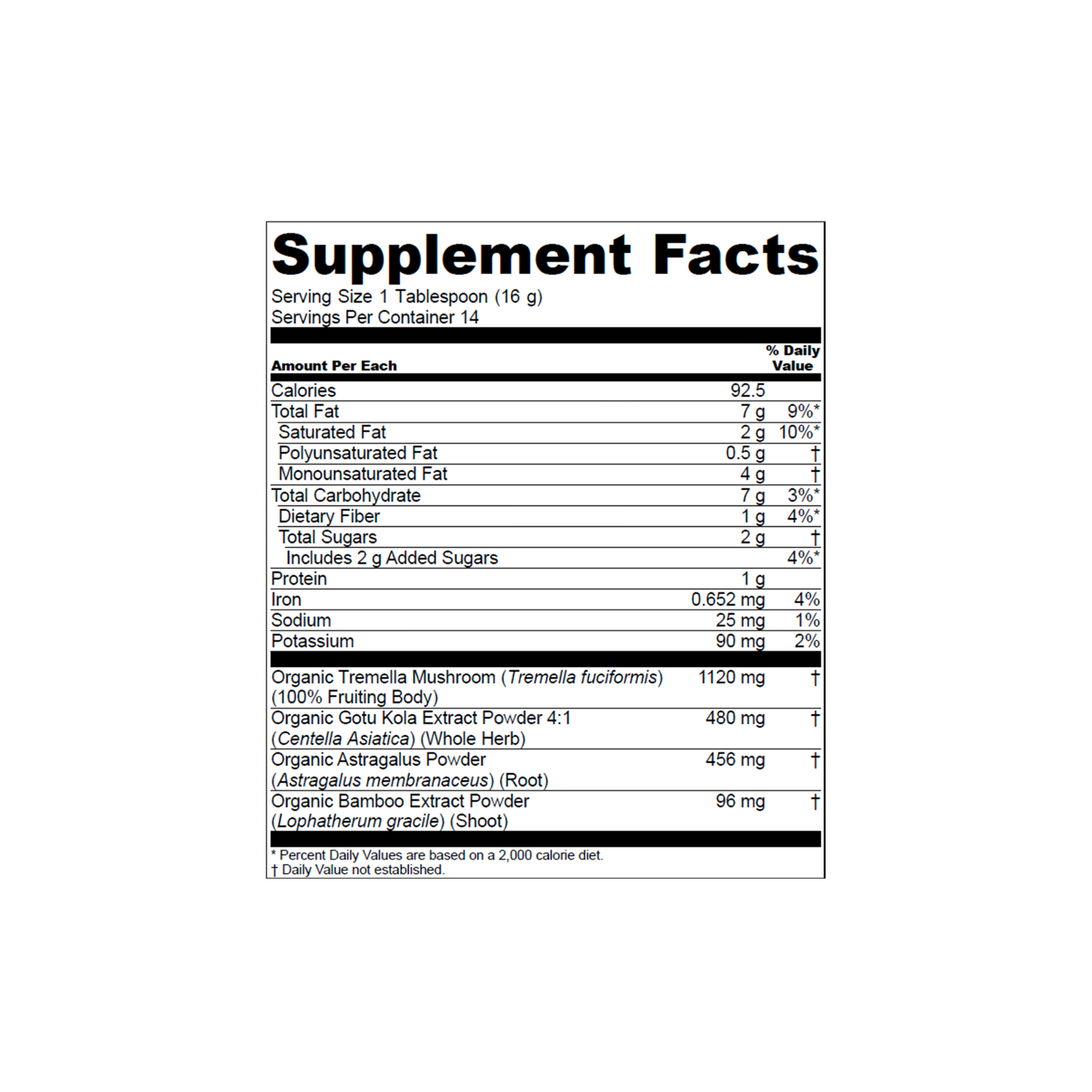 - Adaptogenic Botanicals:Tremella Mushroom 100% Fruiting Body Extract Powder (Tremella Fuciformis)†, Astragalus Root Powder (Astragalus Membranaceus)† , Gotu Kola Extract Powder (Centella Asiatica)†, Bamboo Extract Powder 70% Silica (Bambusa Vulgaris),